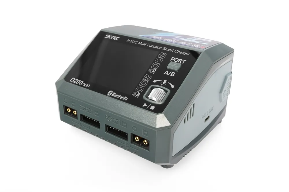 Dvoukanálový nabíječ SKY RC D200neo 800W byl konstruován se snahou poskytnout vše potřebné pro nabíjení dvou akumulátorů velkými proudy současně „pod jednou střechou" včetně síťového zdroje, s jednoduchou obsluhou a možností komunikace s aplikací SkyCharger. D200neo umožňuje nabíjet a vybíjet běžné typy článků (NiCd, NiMH, Li-poly, Li-ion, Li-Fe, Li-HV, Pb), navíc jsou oba kanály vybaveny vestavěnými šestikanálovými balancery, které zajišťují velmi bezpečné a komfortní nabíjení lithiových akumulátorů. Může také pracovat v režimu paralelního nabíjení, kdy oba kanály nabíjejí jeden akumulátor proudem 20-35 A. Při připojení externího vybíječe BD350 potom umožňuje vybíjení proudem až 40 A při max výkonu 350 W.