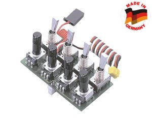 Multifunkční vysílačový modul s organizací 4 přepínače a 4 proprcionální ovladače. Pro rozšíření vašeho vysílače FC-16. Z jednoho proporcionálního kanálu tak získáte osazením tímto modulem 8spínaných funkcí a 4proporcionální kanály. (K přijímači je nutno použít příslušný dekodér) Organizace přepínačů je následující: 3x 1-0-1 a 1x (1)-0-(1). Vysílač FC-16 je možné osadit až dvěma různými multifunkčními moduly.